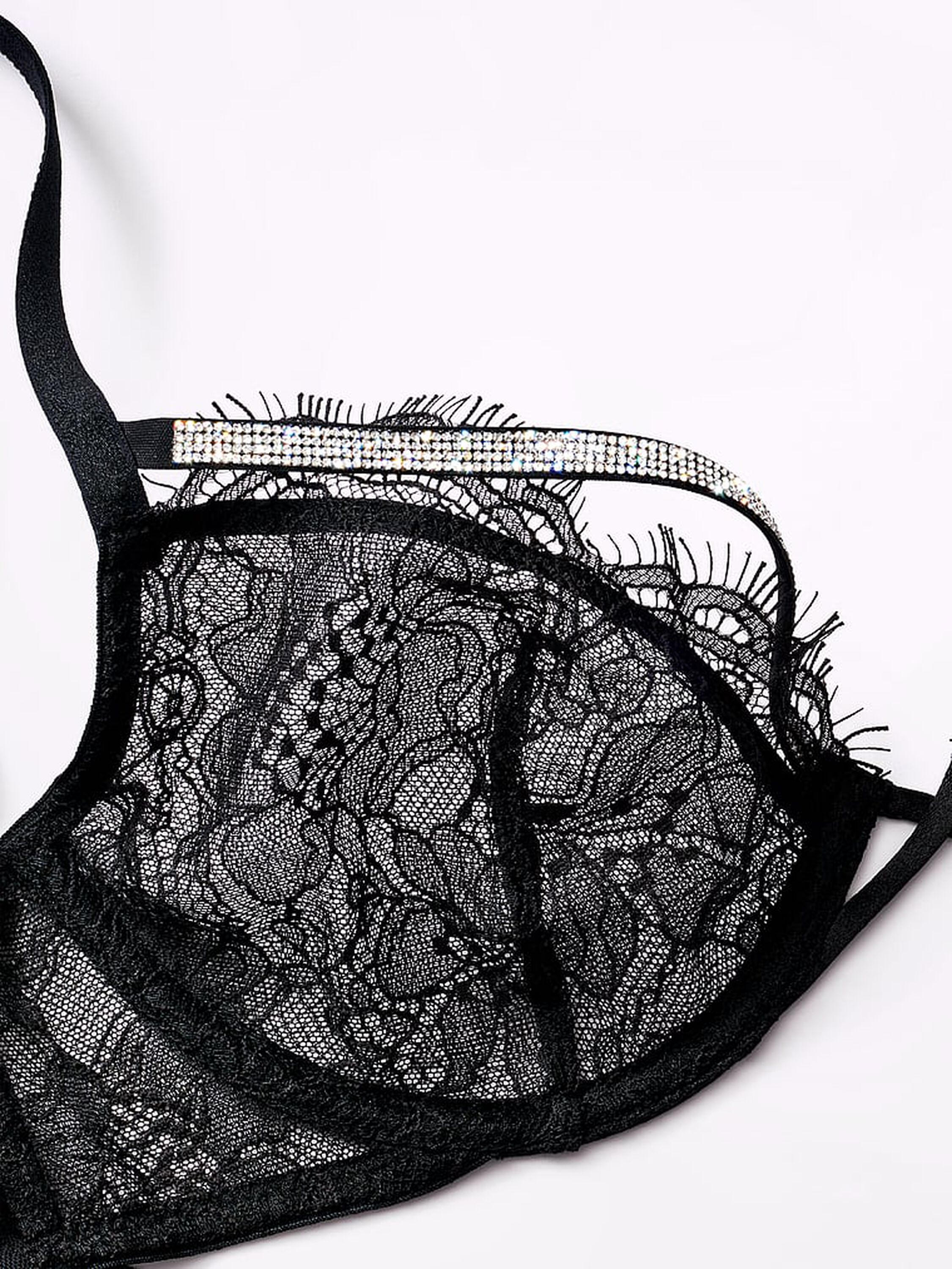 Este estilo de corte extra bajo combina un encaje romántico con brillantes tiras de diamantes de imitación que brillan a lo largo del escote.